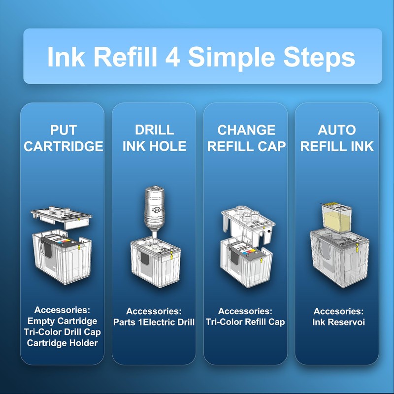 - Complete Set: This package includes 3x Black, 2x Cyan, 2x Magenta, 2x Yellow, Additional Accessories: 1x Cartridge Holder, 1x Black Drill Cap, 1x Tri-color Drill Cap, 1x USB-Powered Drilling Tool, 1x Pair of Cleaning Gloves, 1x User Manual, Note: Please scan the QR code or read the manual before refilling to ensure proper usage.