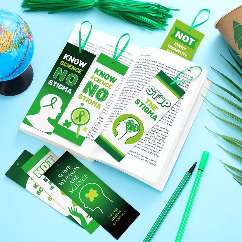 - Green Ribbon Design: our mental health awareness items come with various mental health awareness patterns, including green ribbons, kids, inspirational quotes, and so on, fun and eye catching; These bookmarks feature a green ribbon design and are printed with mental health awareness saying known science, No Stigma or Stop the Stigma, which are ideal for mental health month