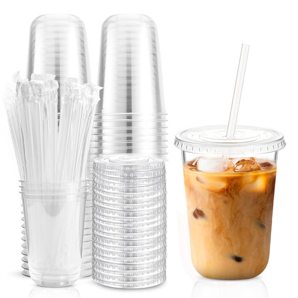 TINSKY 50 Sets Clear Plastic Cups with Lids and Straws, Disposable Iced Coffee Cups Drinking PET for Cold Drinks, Juice, Smoothie, Coffee Shops, Party, Christmas(Clear,12 oz)