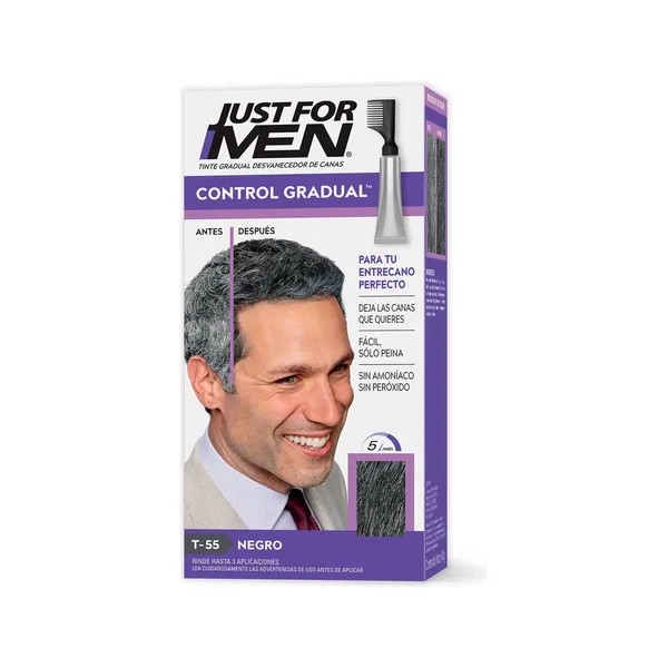 Just For Men Control Gradual es la solución ideal para hombres que buscan un cambio sutil en su apariencia. Tinte sin amoníaco y peróxido, el color negro T55 cubre algunas canas y permite un control gradual del resultado final. Descubre el revolucionario Control Gradual tinte desvanecedor de canas, especialmente formulado para brindarte una apariencia impecable y natural. Este excepcional shampoo para canas no solo cubre gradualmente las canas en cada lavado, sino que también acondiciona y revitaliza tu cabello, dejándolo radiante y lleno de vida. Utiliza este innovador tinte como reemplazo del habitual hasta alcanzar el resultado deseado. Luego, alterna su uso con tu shampoo convencional para mantener un aspecto sutil y auténtico. Experimenta la transformación y cuidado del cabello, logrando un resultado con colores que se adapte a tu estilo de vida. En resumen, con Just For Men Control Gradual y nuestra línea de productos para el cuidado del cabello y la barba, los hombres pueden mantener un aspecto fresco y joven por más tiempo.