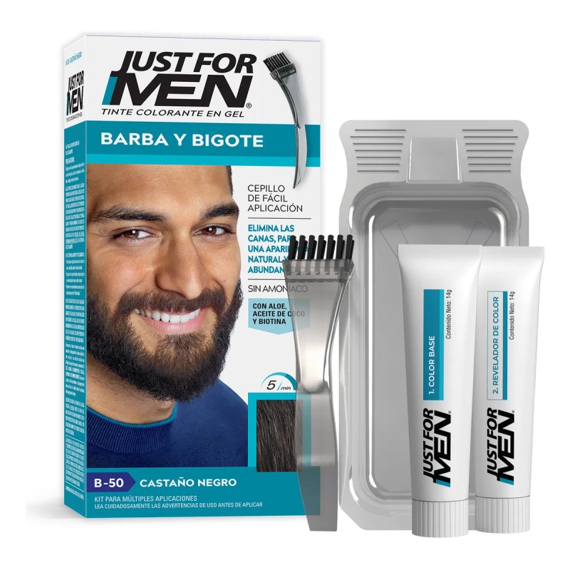 - El Tinte Para Caballero Just For Men Barba Y Bigote Castaño Negro 28g proporciona un color natural y uniforme, ideal para cubrir canas.