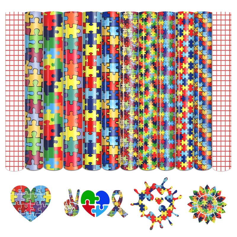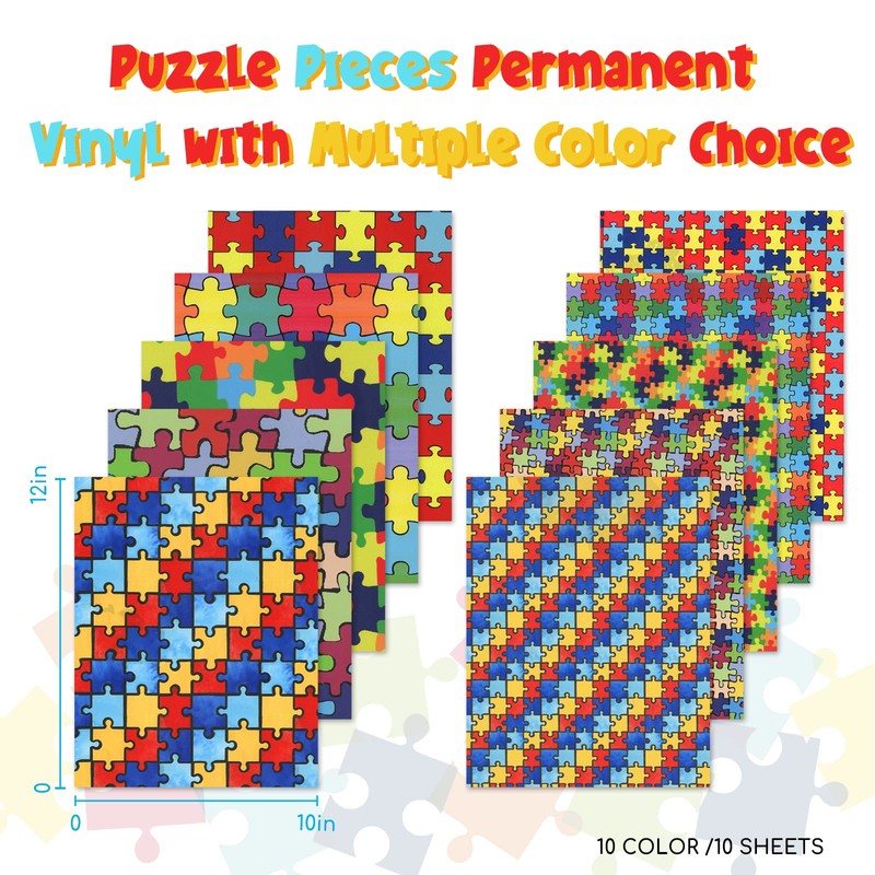 Tintnut Puzzles Permanent Vinyl - 10 Sheets 12"x10", Autism Awareness Puzzles Patterned Permanent Adhesive Vinyl for Cutting Machine,Home Decor Self Sticker