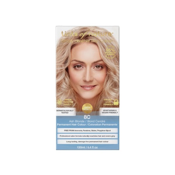 Tints of Nature 8C Ash Blonde home hair dye has been carefully developed with over 75% certified organic and 95% naturally derived ingredients, to gently nourish and protect your hair for gentle, home hair colouring. Tints of Nature 8C will provide maximum colour performance and up to 100% grey coverage and give long lasting results.
