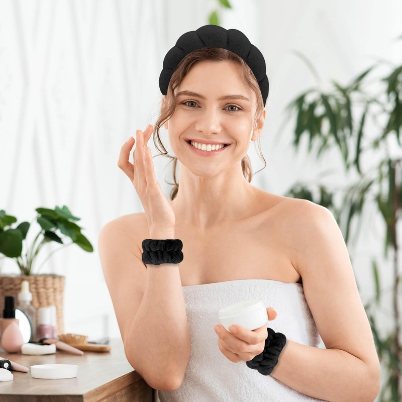 Tiny Chou 5pcs Spa Headband and Wrist Bands Set for Washing Face, Terry Cloth Puffy Makeup Facial Skincare Headbands for Women, Soft Hair Face Wash Accessories, Black