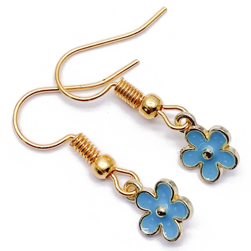 Tiny Daisy Flower Charm Earrings, Light Blue Enamel Charm Beads on Nickel Free Gold Tone Hooks : 28mm long, Floral Gift for Women, Flower Drop Earrings