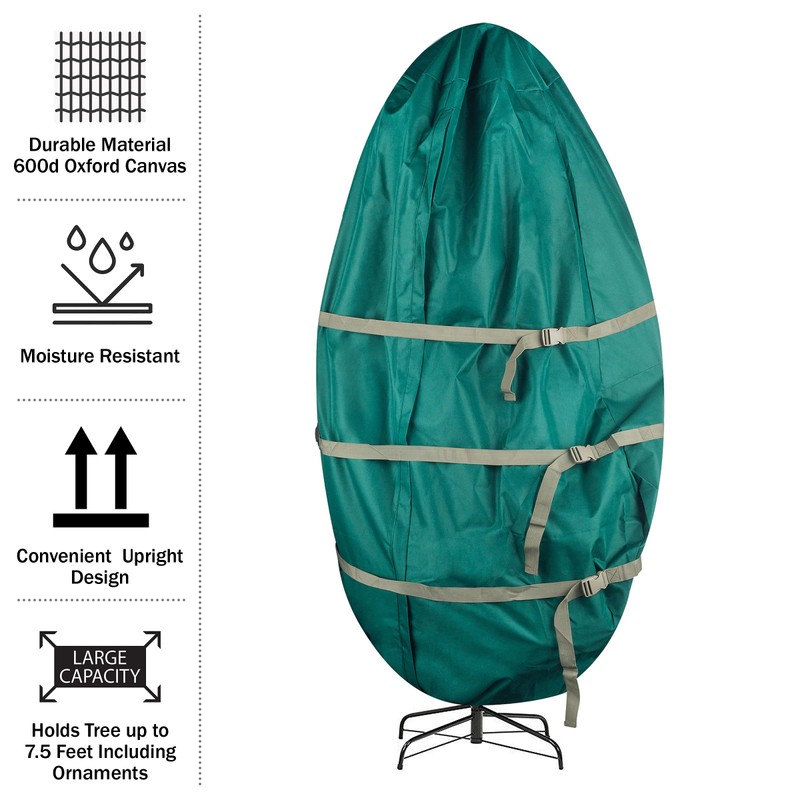 If you are looking for a way to store away your Christmas tree, but don't want to take it apart completely and try to stuff it into a duffel bag, then Tiny Tim Totes has just what you need. This thick canvas cover is designed to protect your Christmas tree while it is still standing. All you have to do is take the coveroff next year and decorate your tree. No more trying to figure out what part is "Part A" and what part is "Part B". Tiny Tim Totes Christmas Tree Covers are made from durable 600d Oxford Canvas and lined with PVC making themthick enough to last year after year. It is easy to use, just unzip the Christmas Tree Storage Cover, wrap it around your 7 1/2 foot tall artificial tree, zip and buckle! SATISFACTION : Tiny Tim Totes is committed to providing the consumer with the absolute best price and value on our entire line of products, which we ensure by applying a rigorous quality control process. NOTE: This is an exclusive product of Tiny Tim Totes and ONLY Christmas Tree Storage Bags by Tiny Tim Totes are to be genuine. IMPORTANT: Avoid buying counterfeit products and transacting with unauthorized sellers. Look for our logo on the packaging for every one of our products. Specifications: DIMENSIONS - Measures 56 x 74 inches (LxH), unfolded and expanded. Covers up to a 7. 5 foot artificial tree. LONG LASTING - Great for long or short term storage, contain your standing Christmas tree with this canvas cover. EASY - The heavy duty zipper spans almost the entire length of the cover, making it a breeze to take on and off. PROTECTIVE - The convenient cinch cord at the bottom helps protectfrom dirt and dust, moisture, and vermin. PRODUCT DETAILS - Material: Canvas. Color: Green. Dimensions: 56 x 74 inches (LxH), when laid flat. Full 1 Year .