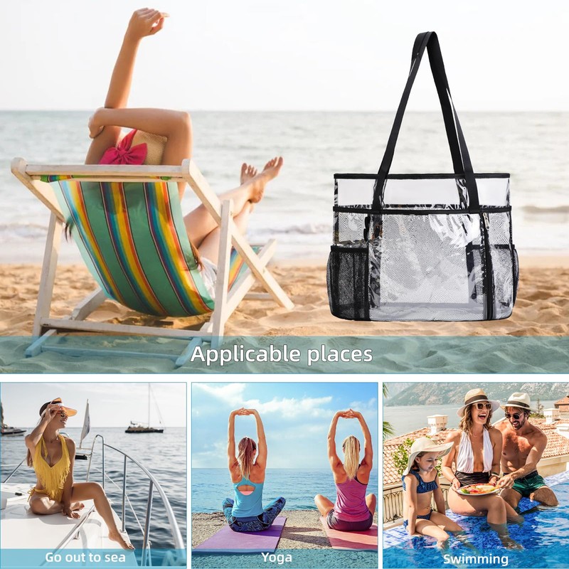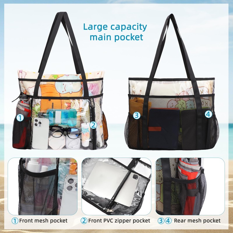 - 【The Design of Sandproof】Our mesh beach bag for women are made of high-quality, anti-tear mesh material and PVC transparent material. The breathable mesh design helps to drain sand and water more easily and keep gear dry or visible.When using them at the beach, you can place your beach tote on the mat to prevent sand from sticking to the contents.When you go home, simply shake the oversized beach bag to remove any sand from the bags, avoiding bringing sand into your car or home.