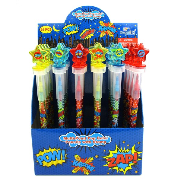 TINYMILLS 24 Pcs Superhero Rainbow Stackable Crayon with Stamper Topper