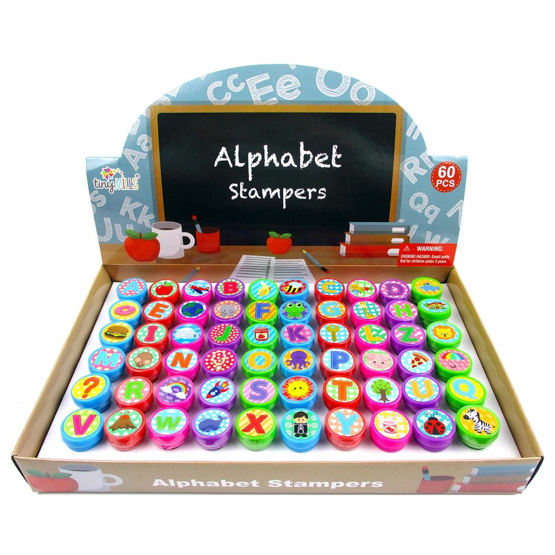 巨大な60ピース入りアルファベット・スタンプセットです。Aはappleとairplane、Bはbananaとbee、Cはcaterpillarというように、A~Zの大文字26文字と、A~Zの文字音が使われたアイテムが最大2つ入っています。セットには60種類のスタンプデザインが含まれます。自宅学習で楽しくアルファベットを教えるのにも最適です。