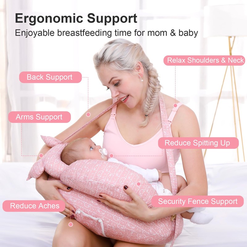- Ergonomic Design: The U-shaped contour of the pillow fits snugly around your waist, providing optimal support for your arms and back during feeding sessions. This design helps reduce strain and promotes proper posture, making it easier to nurse or bottle-feed your baby comfortably.