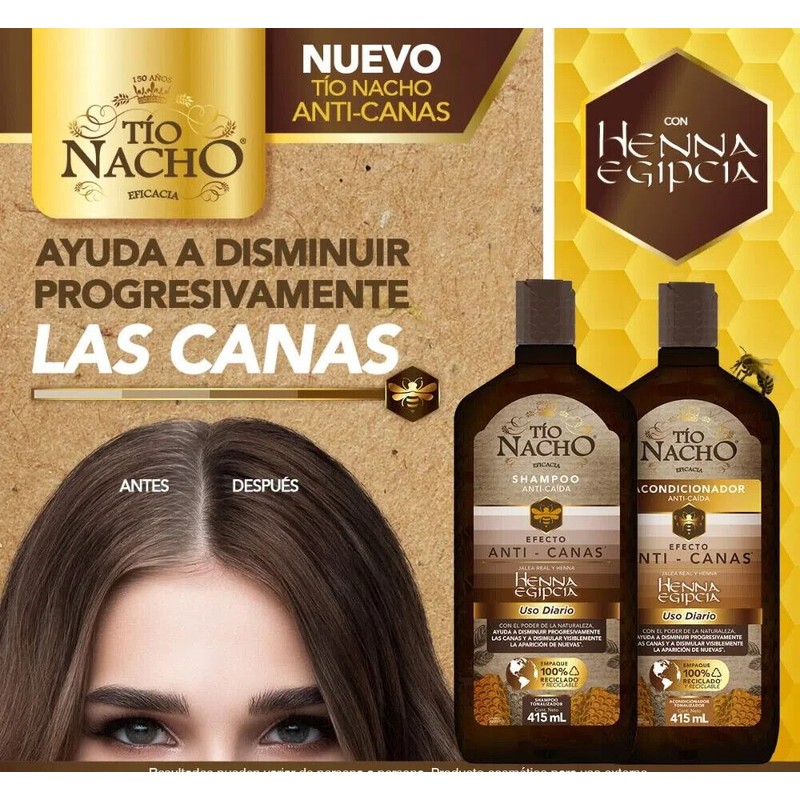 El acondicionador Tío Nacho Canas de 415 ML es un producto especialmente diseñado para el cuidado del cabello canoso o gris. Su fórmula enriquecida con ingredientes naturales como el extracto de jengibre, la manzanilla y la jojoba, ayuda a nutrir y fortalecer el cabello, dejándolo suave, brillante y fácil de peinar. Además, este acondicionador ayuda a reducir la apariencia de las canas y a prevenir su aparición prematura, gracias a su contenido de extracto de ginseng y biotina. Tío Nacho renews its image to give you healthier Hair and Planet. Tío Nacho ANTI-FALL EGYPTIAN HENNA provides an ANTI-GRAY HAIR effect, progressively reducing gray hair and preventing the appearance of new ones. With the infinite power of ROYAL JELLY, you begin to notice less hair loss after 5 weeks of use.