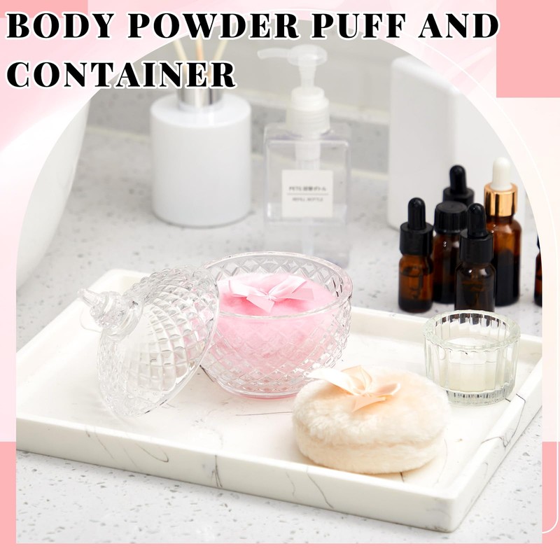 Tioncy 3 Pcs Large Body Powder Puff and Container Glass Powder Container with Puff Powder Puff Crystal Container Soft Washable Reusable Velour Face Body Glitter Powder Puff Wet Dry Makeup