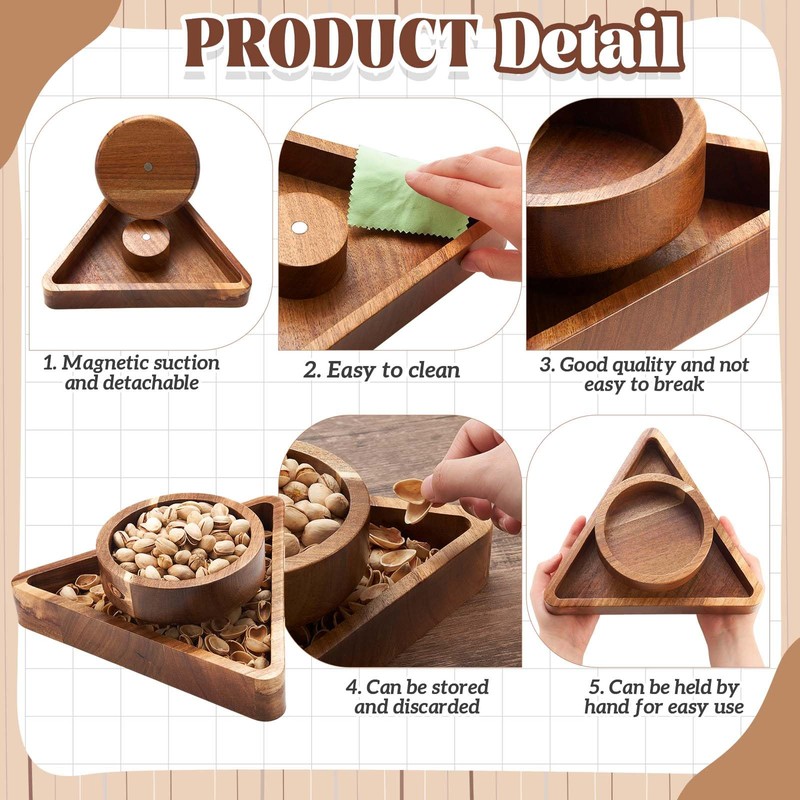 - Practical Design: the nut bowl with shell holder is not just a convenient container for everyday snacks or cooked foods, but the base layer also stores shells, pits, or food remnants, creating a cleaner indoor environment; The magnetic design in the middle securely connects the two layers, preventing spillage and allowing easy separation of the wooden bowls for quick food waste clearance