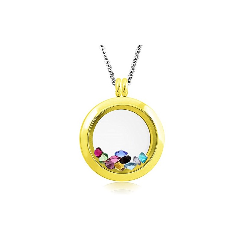Tioneer 25 MM Stainless Steel Floating Glass Charm Locket Pendant Necklace with 10 Randomized Colored Stones (Gold)