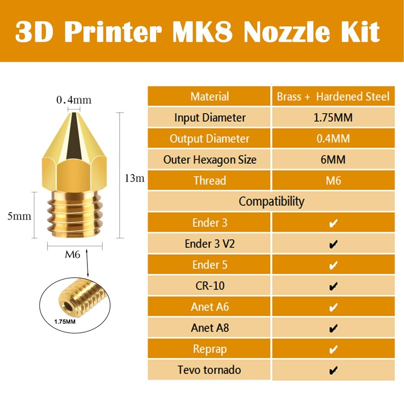 - TIOPY 3D printer MK8 nozzles specification: input diameter: 1.75 mm; output diameter: 0.4 mm; screw thread: M6 thread connection.Suit for all filament with diameter 1.75 mm (PLA、ABS、PETG、TPE、TPU、PC)