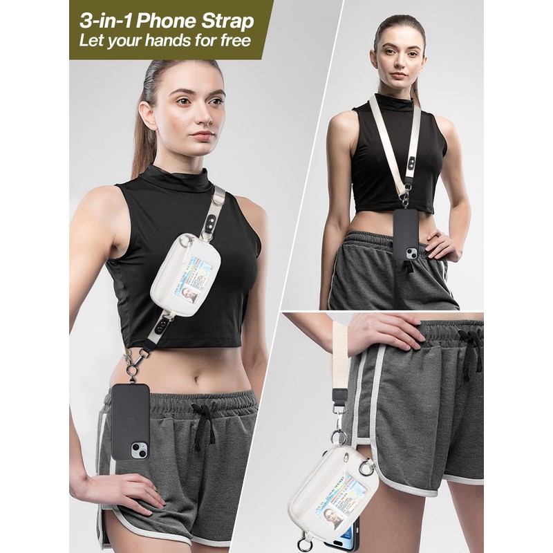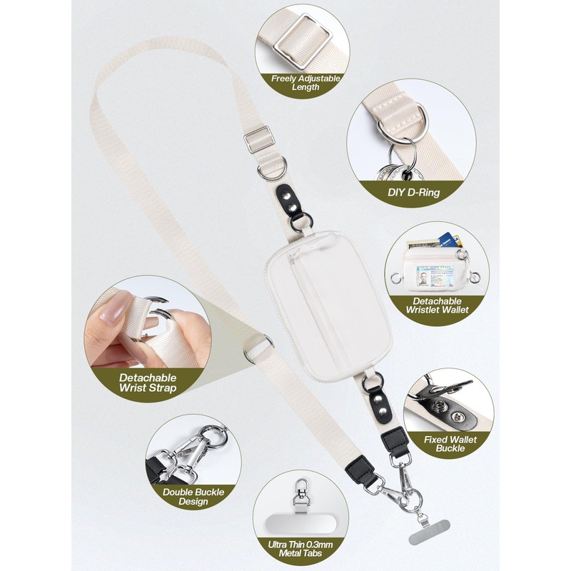 Tiostep Clip and Go Strap for Phone with Wallet Crossbody Phone Lanyard Adjustable and Detachable RFID Wristlet Wallet with ID Window and Zipper, Cream
