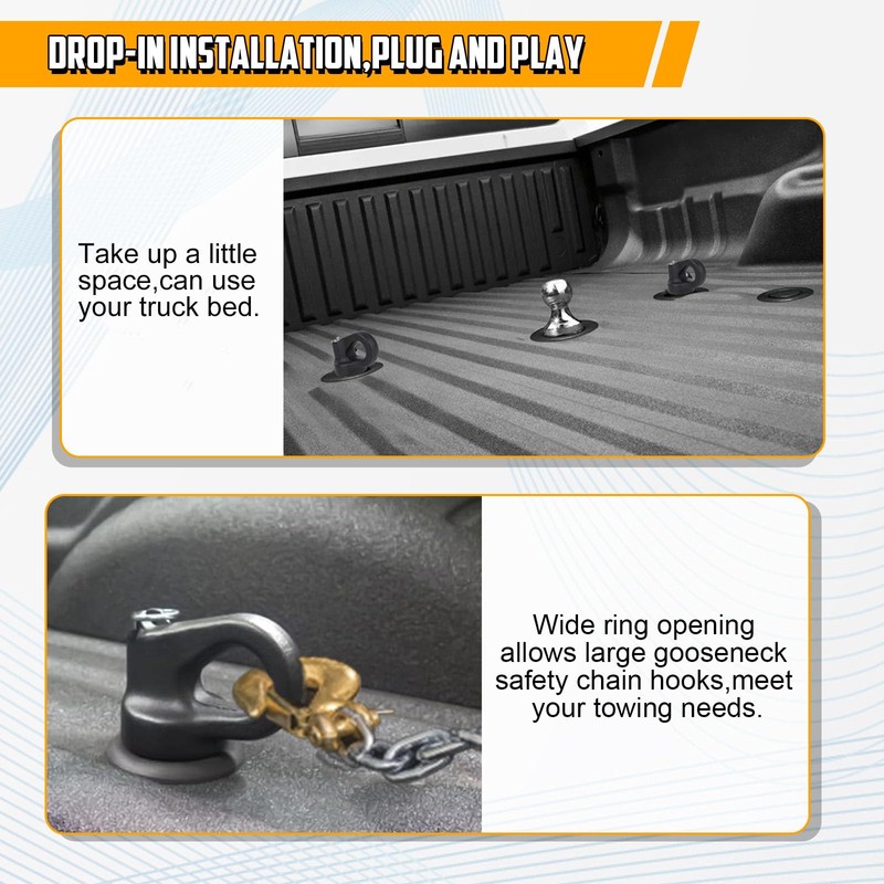 • 【Easy to Install】Drop-in installation,enhancing convenience,allow you quick connect or disconnect as needed.Just press down the control button on the top of the gooseneck ball;then Insert it into the gooseneck hole in your truck bed,release the button to secure it.