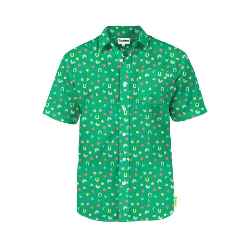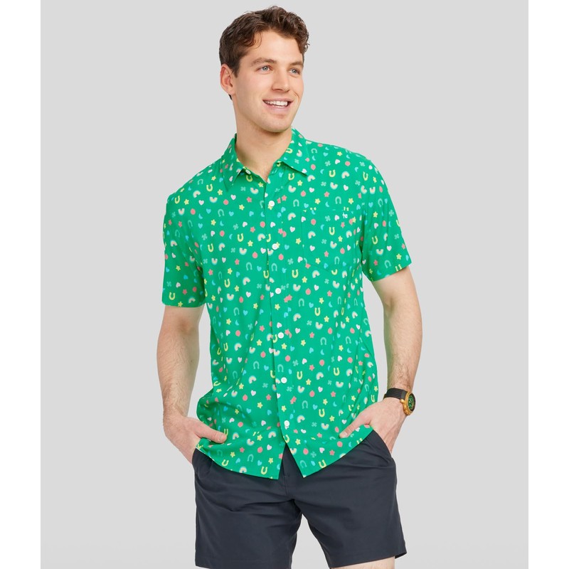 Tipsy Elves Button Down Shirts for Men - Valentine’s Day, Mardi Gras and St Patrick’s Day Men’s Button Ups - Green Lucky Charmer St Patricks Day Short Sleeve Hawaiian - Size Medium