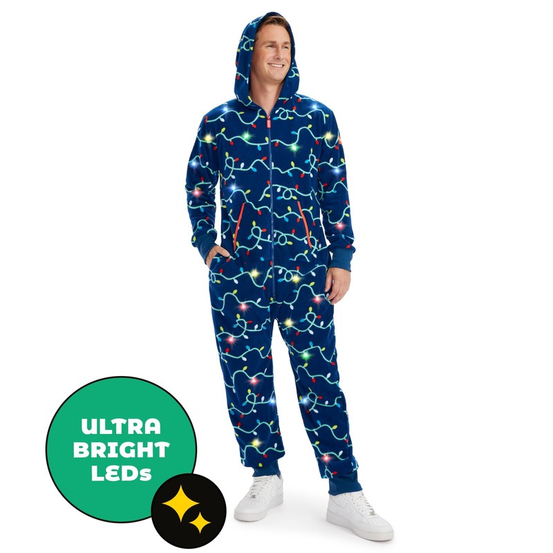 Tipsy Elves Christmas Onesies for Adults - Comfy Unisex Matching Holiday Jumpsuits with Convenient Pockets - Cozy Blue String Of Lights Christmas Jumpsuit Size Large