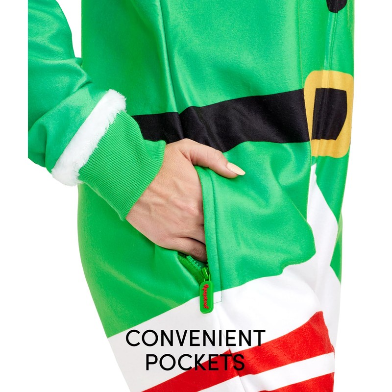 - CONVENIENT POCKETS Tipsy Elves adult onesies for christmas feature convenient, zippered side pockets offer plenty of room for storing unreasonable amounts of christmas candy and keeping it safe.