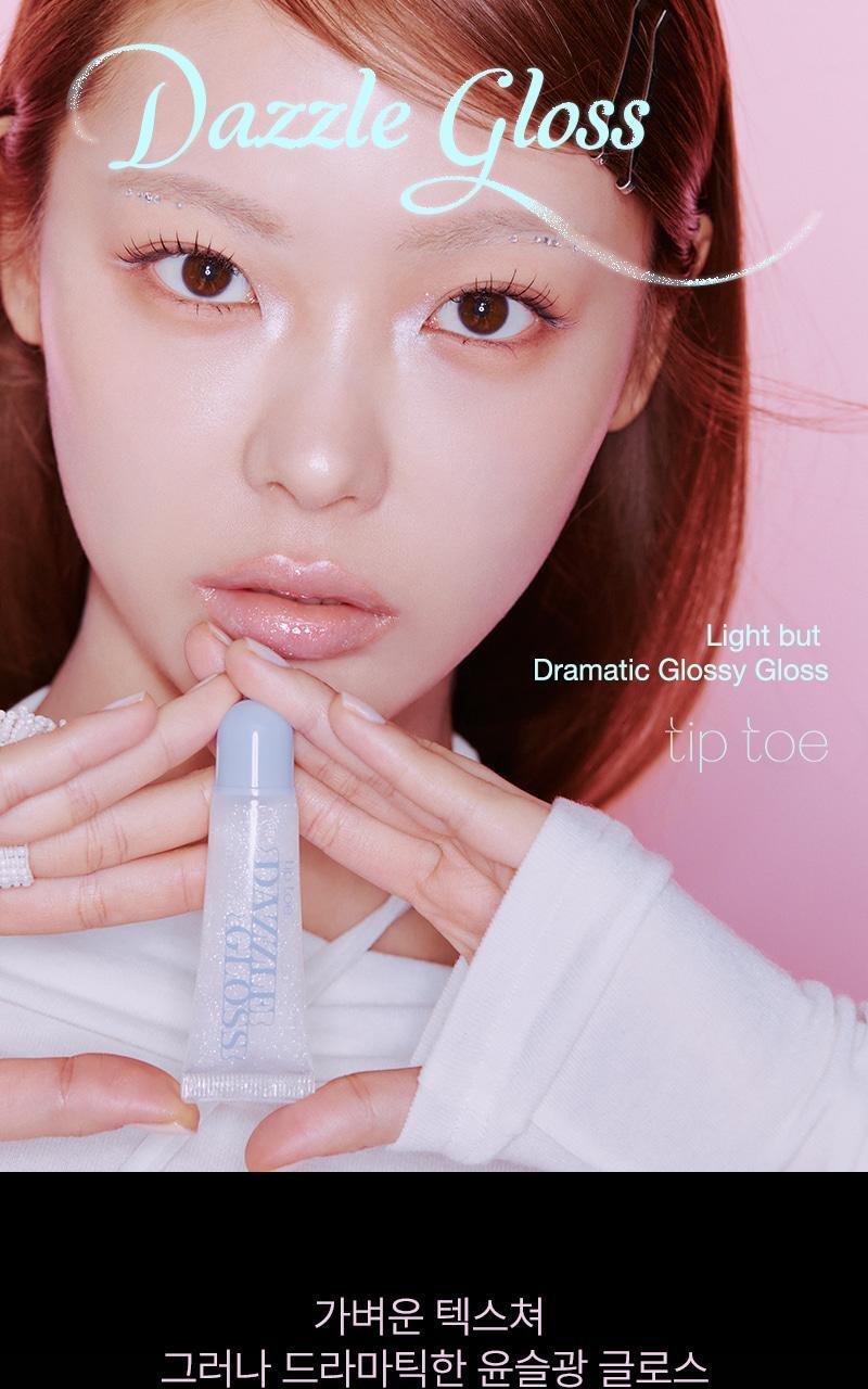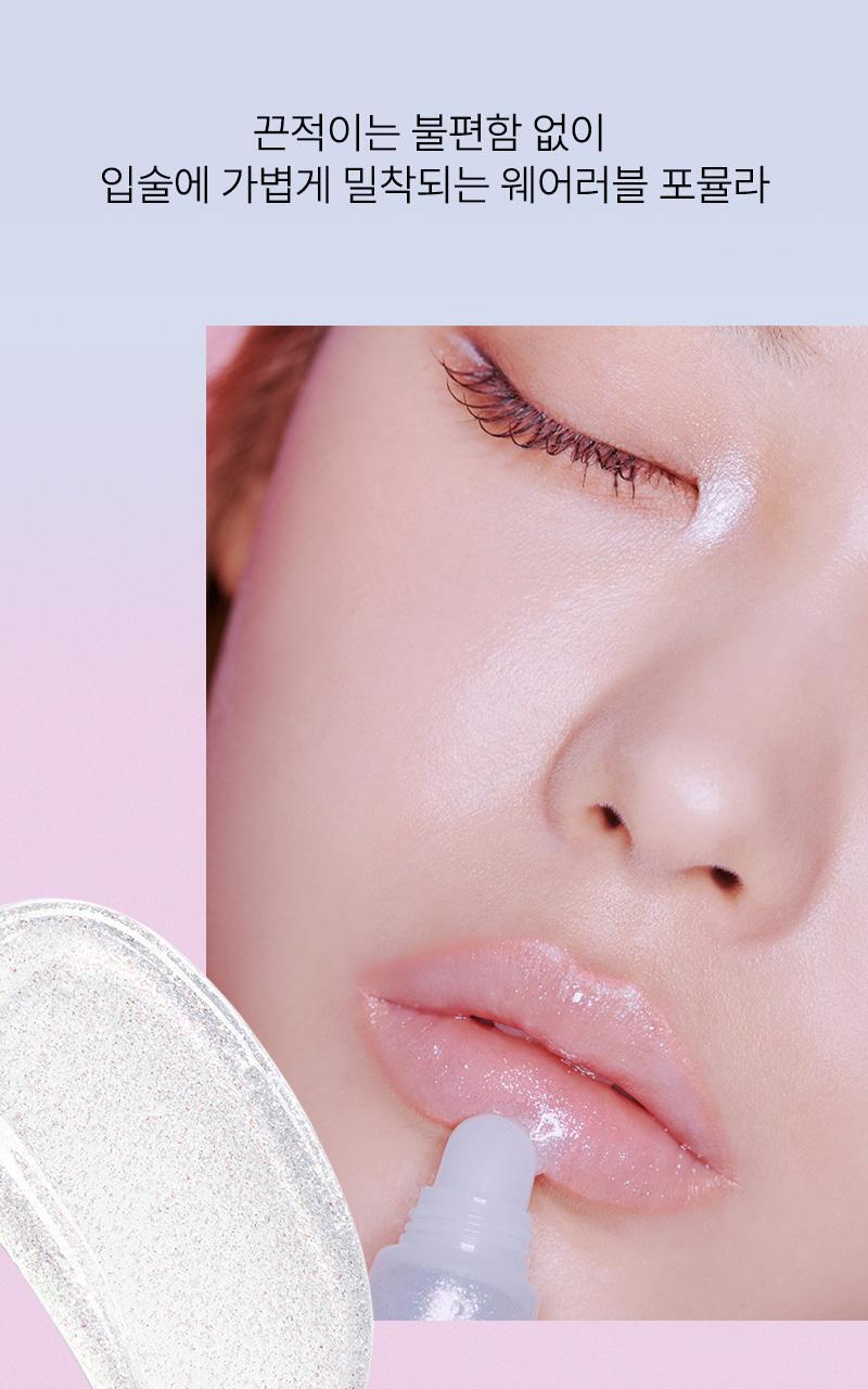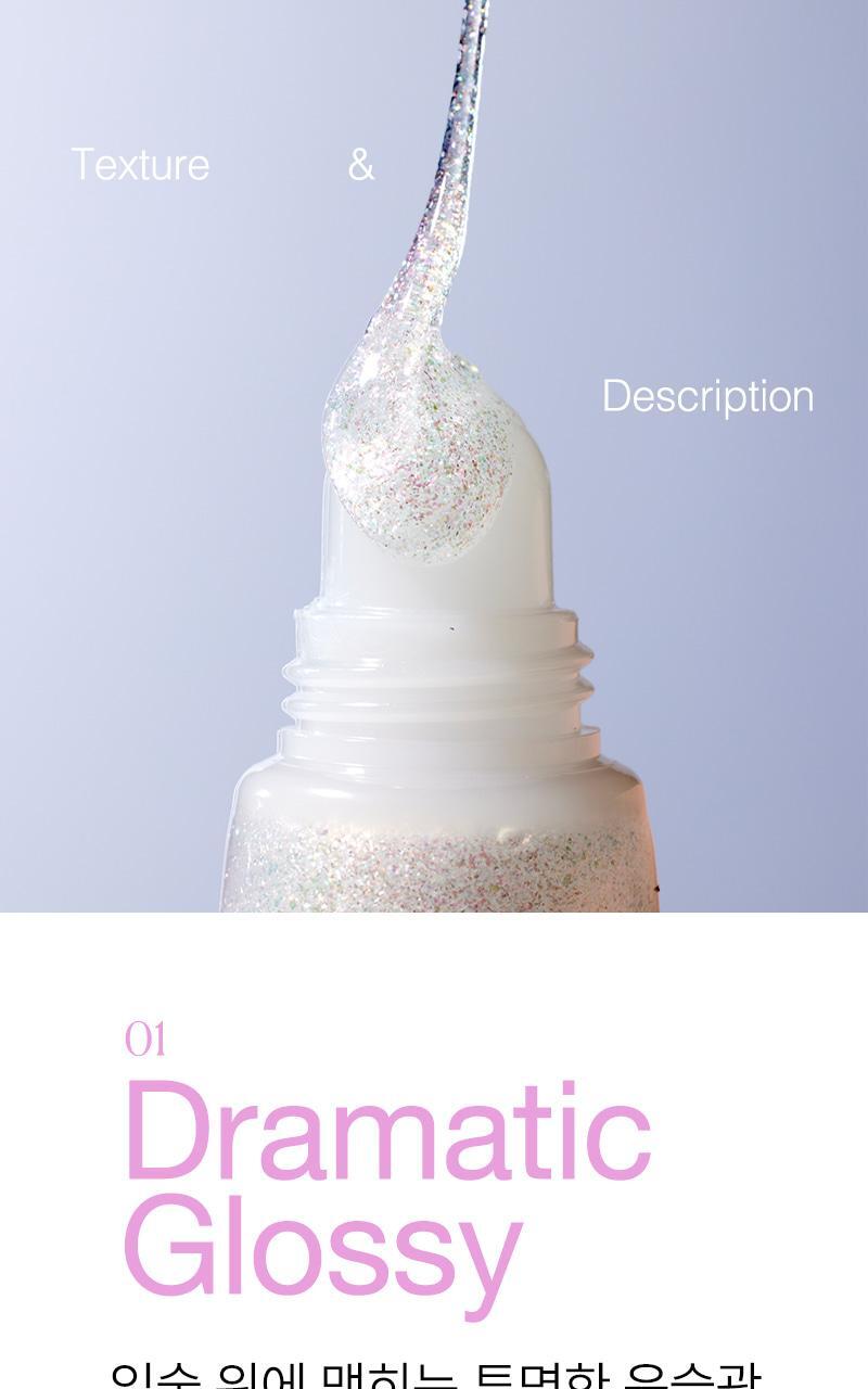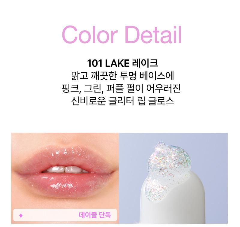 Delivers a scoop of sparkling peptides and vegan collagen to the lips. Provides an ultimate shimmer that matches any lip color you have. When matched with tiptoe Jelly Stick, it transforms into a sparkling summer juicy lip. Light texture, but a dramatic glossy effect. Showcasing a fantasy gloss fantasy with a light feel proposed by tiptoe. Shows a transparent glossy effect on the lips. A water coating texture that is more lively than oil shine. Adds moisture to the lips and provides a water coating effect with a moisturizing texture. A wearable formula that lightly adheres to the lips without sticky discomfort with an indescribable smooth and light feel. Provides a fresh and clean finish even when layered over desired colors. A mysterious glitter lip gloss that combines pink, green, and purple pearls on a clear and transparent base.