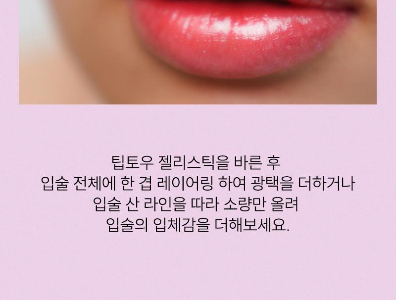 After applying tiptoe Jelly Stick, layer it on the entire lips to add gloss or apply a small amount along the lip line for a more three-dimensional look.