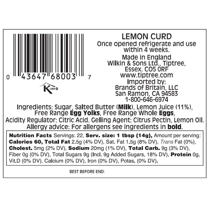 Tiptree Lemon Curd is an all natural fruit curd made from fresh egg yolks (each egg individually broken with the yolk separated from the white), dairy butter and lemons from Sicily (the best and most flavorful lemons found in the world). Lemon curd has a large range of uses, from Lemon Tarts to a spread or a filling for cakes or other desserts. Lemon Curd can be spread on toast, crumpets, English Muffins or pancakes. It can serve as a filling for cakes, trifles, tarts and even sandwich cookies. Mix with whipped cream and serve with berries for a delicious treat.