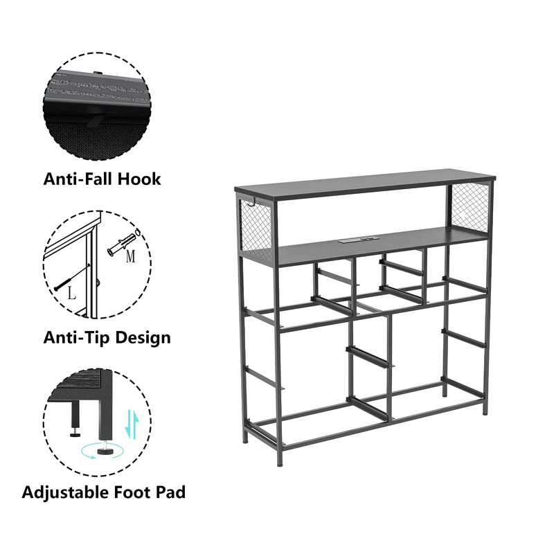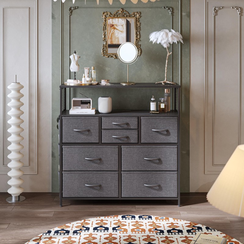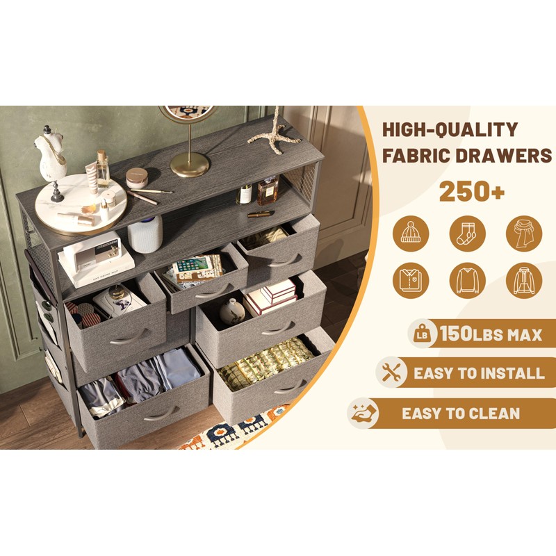 TIQLAB Dresser for Bedroom with 8 Drawers, 38.5” Tall Storage Tower with Fabric Bags, Double Wide Chest of Drawers with Led and Power Strip and Metal Frame for 40” TV, for Kids Room,Entryway, Black