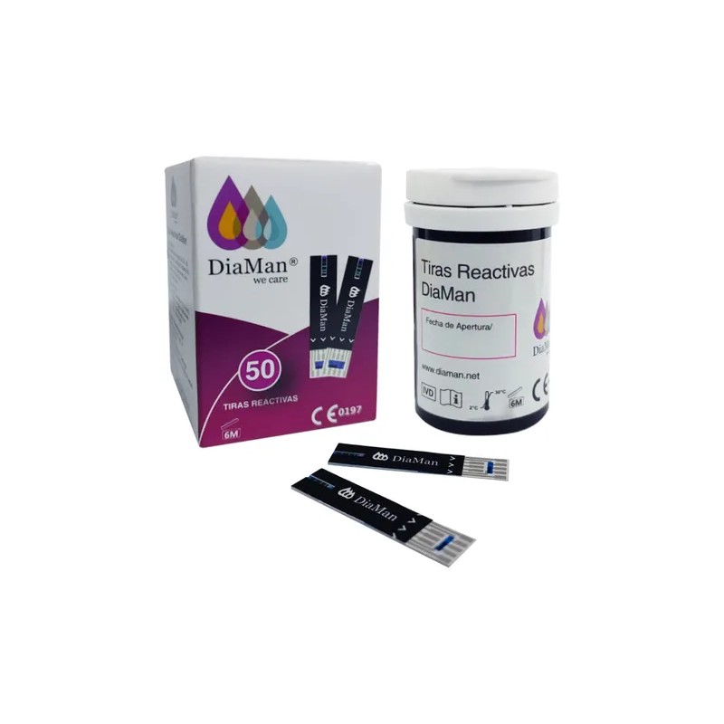 Frasco con 50 Tiras Reactivas DiaMan compatibles únicamente con glucómetros de la marca Diaman