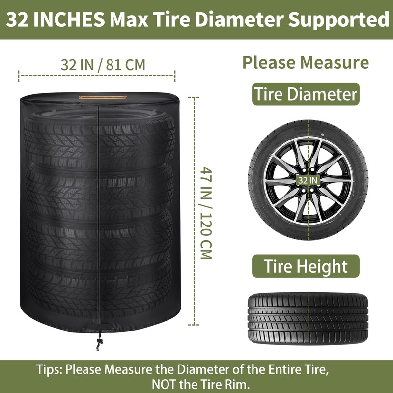 - Universal Covers Fit for Most Spare Tires: Our outdoor tire storage cover is universal fit and suitable for spare tires of different styles and brands.4 tires within 32 inches in diameter can be stacked.Dimension:33 inch Diameter x 47inch H.It is suitable for tire storage of RV, trailers, campers, cars and trucks.Tips: Please measure the Diameter of the Entire Tire, NOT the Tire Rim.
