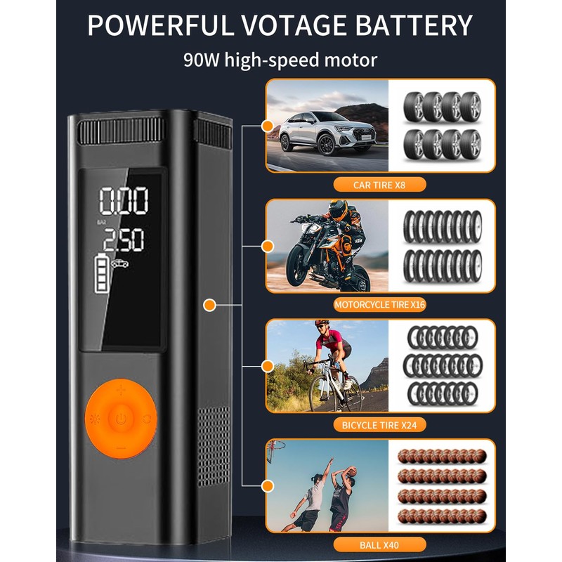- 🚗【High Power Smart Air Pump】Portable air compressor built-in 90W powerful motor 3X faster inflation, max air pressure 150psi , 2 minutes to fill car tires, 1 minute to fill motorcycle tires, 30 seconds to fill ball. car tire pump meets all kinds of inflation needs, it is a necessary product for daily life and travel.
