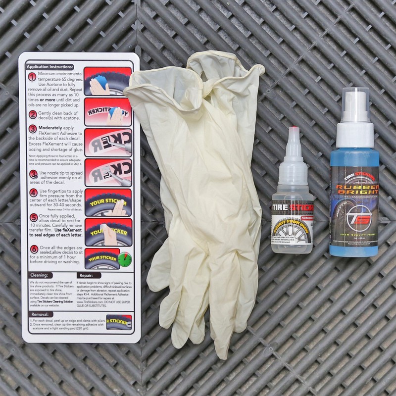 Step 2: Apply a thin even layer of glue on the backside of the letters, applying glue to only a few letters at time to get started. Place the decal on the clean section of the tire and gently apply even pressure for 1-2 minutes. Inspect decal and clean any 'oozing' if necessary. Hold for additional time as needed. Ideal install temperature 72 F Degrees.