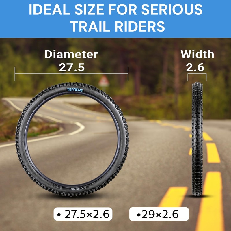 Tires for Mountain Bike by Terrene - Chunk Tough 27.5X2.6 Inch, 60 TPI Lightweight, Tubeless Mountain Bike Tire for Aggressive All Season Riding - Bike Accessories with TekShield Casing