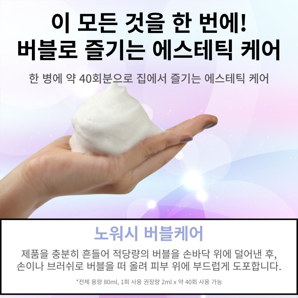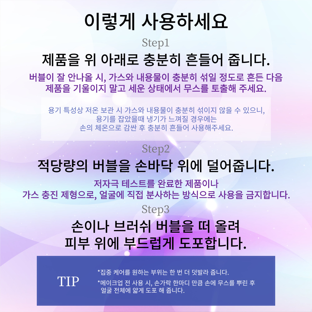 • How to use: 1. Shake the product up and down sufficiently. 2. Dispense an appropriate amount of bubbles onto your palm. 3. Scoop up the bubble and apply gently onto the skin.