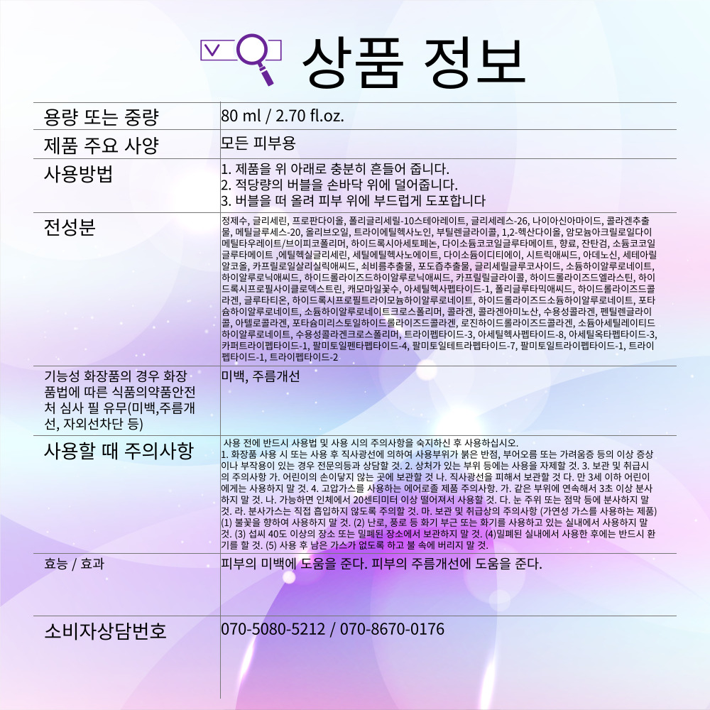 • All ingredients: Purified water, glycerin, propanediol, polyglyceryl-10 stearate, glycerol-26, niacinamide, collagen extract, methyl glucose-20, olive oil, triethylhexanoin, butylene glycol, 1,2- Hexanediol, ammonium acryloyl dimethyl taurate/V picopolymer, hydroxyacetophenone, disodium cocoyl glutamate, fragrance, xanthan gum, sodium cocoyl glutamate, ethylhexylglycerin, cetyl ethylhexanoate, disodium EDTA, citric acid, adenosine, cetearyl alcohol, capryloyl salicylic acid, purslane extract, grape juice extract, glyceryl glucoside, sodium hyaluronate, hyaluronic acid, hydrolyzed hyaluronic acid. Lonic Acid, Caprylyl Glycol, Hydrolyzed Elastin, Hydroxypropylcyclodextrin, Chamomile Flower Water, Acetyl Hexapeptide-1, Polyglutamic Acid, Hydrolyzed Collagen, Glutathione, Hydroxypropyl Trimonium Hyaluronate, hydrolyzed sodium hyaluronate, potassium hyaluronate, sodium hyaluronate crosspolymer, collagen, collagen amino acid, water-soluble collagen, pentylene glycol, atelocollagen, potassium myristoyl Hydrolyzed collagen, rosin hydrolyzed collagen, sodium acetylated hyaluronate, water-soluble collagen crosspolymer, tripeptide-3, acetylhexapeptide-8, acetyloctapeptide-3, copper tripeptide-1, Palmitoyl pentapeptide-4, palmitoyl tetrapeptide-7, palmitoyl tripeptide-1, tripeptide-1, tripeptide-2