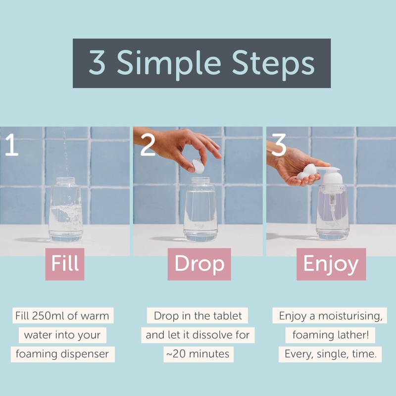 - HOW IT WORKS: Fill a bottle with tap water, drop in a tablet, and enjoy a full bottle of hand soap. Each tablet makes 8 to 10 fl oz of foaming hand soap. Compatible with foaming dispensers only.