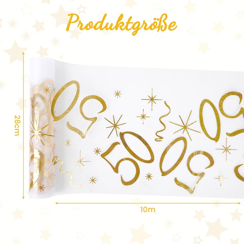 Dieser goldene Tischläufer zum 50. deko geburtstag misst 10 m x 28 cm. Er besteht aus Polyester und wurde mit Heißprägetechnik hergestellt. Das Design ist elegant und neutral. Er ist zuschneidbar und waschbar. für 50. geburtstag frauen und 50. geburtstag männer, Er eignet sich für Partys oder die Dekoration zu Hause und sorgt für eine festliche Atmosphäre.
