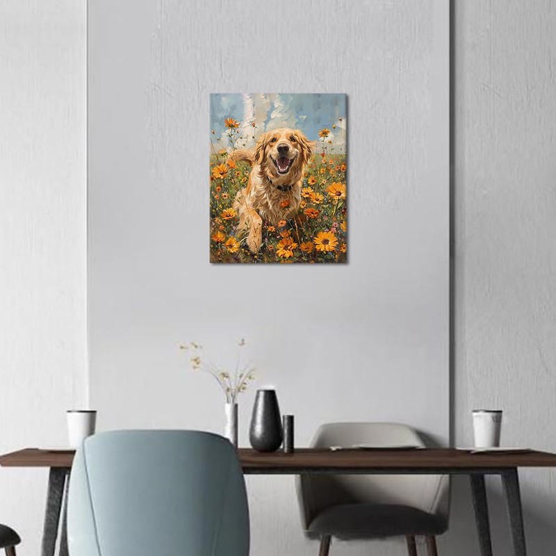 TISHIRON DIY Paint by Numbers Golden Retriever Playing Paint by Number for Adults with Paintbrushes Field of Wildflowers Painting by Numbers Kits on Canvas Art Crafts - 16"x20"(Frameless)