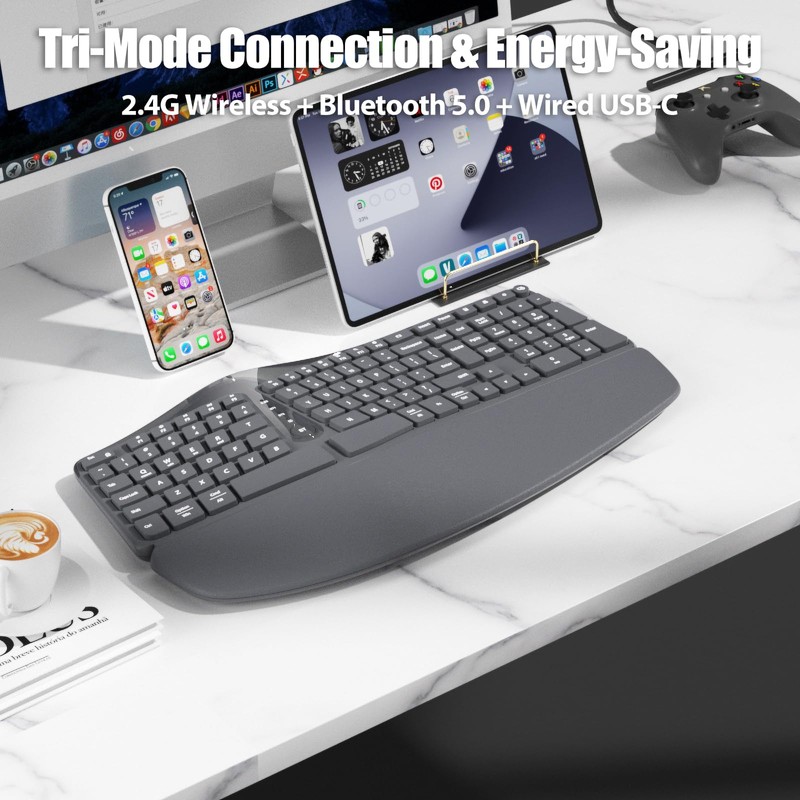 TISHLED Bow Split Ergonomic Keyboard Wireless with Cushioned Wrist & Palm Rest, Wireless 2.4G/Bluetooth/Wired USB-C, Comfortable Natural Typing, Compatible with Windows/Mac/PC/Laptop, Space Grey