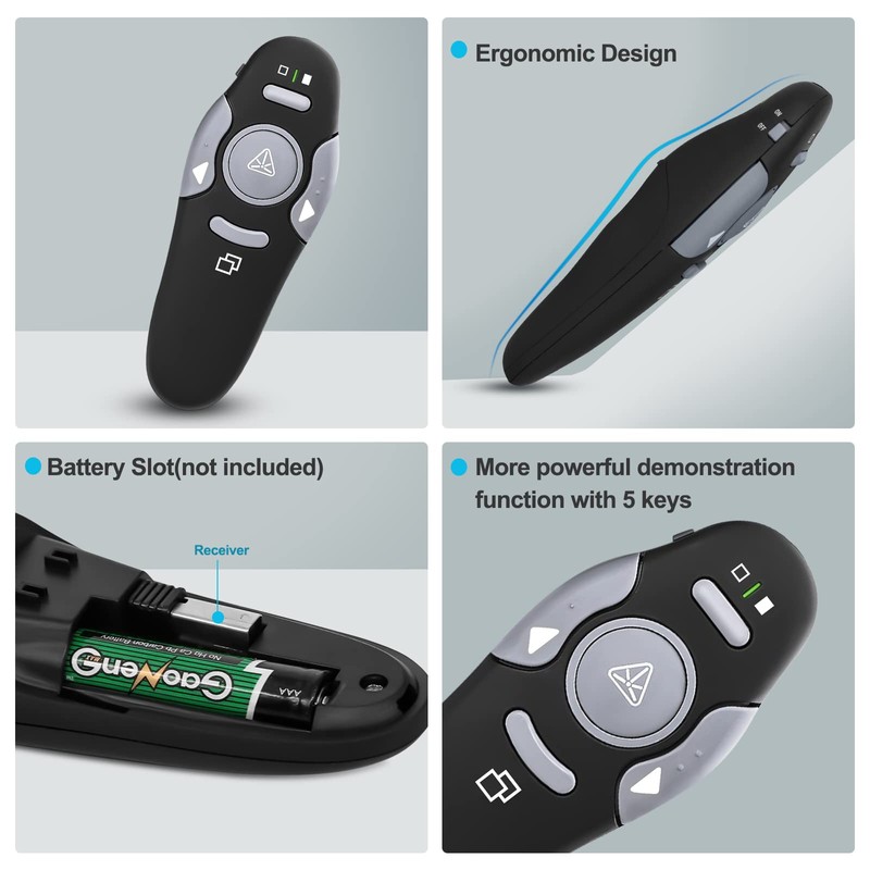 - Red Laser Pointer : This presentation remote produces a red laser pointer, which allows presenters to give a chrystal clear explanation. It can not only be a clicker for powerpoint presentations but a pointer for pet chasing (Do not shoot directly at eyes of people/animals).
