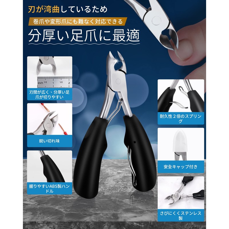 - 【爪切り セット】巻き爪、厚い爪、硬い爪、爪囲炎、陥入爪、変形爪などのケアに適した高品質爪切りセットです。セットには刃先の形が異なる二種類の爪切り ニッパー、爪切り、爪ヤスリ、甘皮リッパーと爪垢取り両用ゾンデが含まれ、自宅で爪のセルフケアができます。