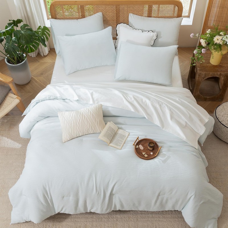 - 【EASY CARE】The king comforter Glacier Blue set is easy to clean. Machine wash in a gentle cycle with cold water, For year round softness and prevent pilling up, it is highly recommended to wash it sun-dry or tumble dry in low. Its subtle yet dense stitches prevent the filling from shifting. due to our bedding comforter sets are vacuum packed, you can expose it to sunlight and tap gently, then it will re-fluffed nicely after hours.