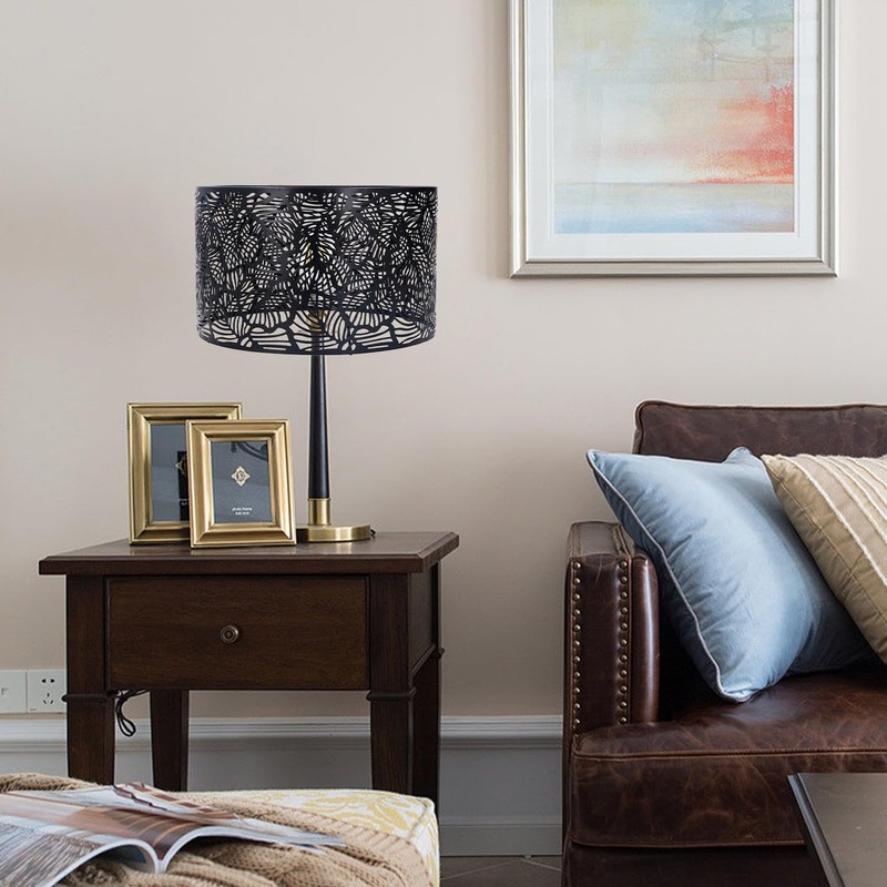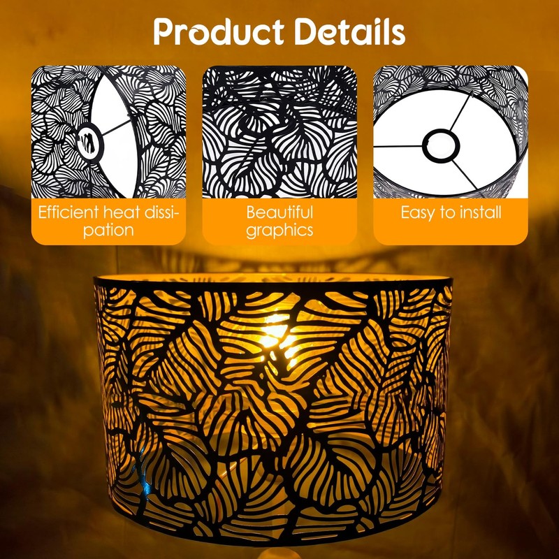 - Iron material: drum lampshade. Made of high quality iron material, beautiful patterns are made by engraving process, covered with a layer of anti-protective paint, good heat dissipation and strong light transmission.
