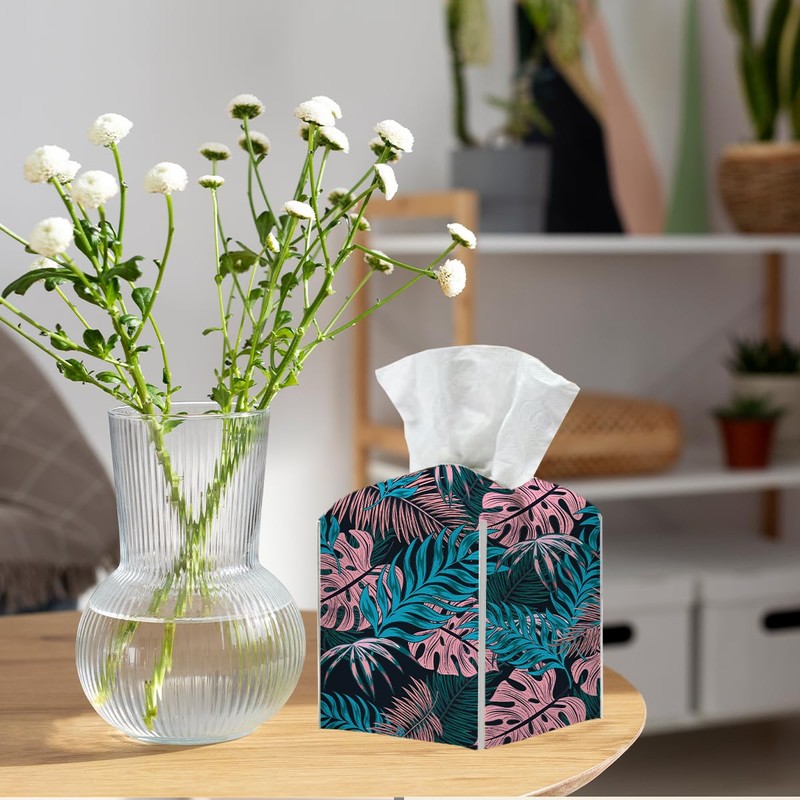 Tissue Box Cover, Tissue Box Holder, Square with Belt Bottom, PU Leather Decorative Organizer for Desk, Tabletop,Bathroom, Toilet Car, Office, Dresser Bedside, Aesthetic Tropical Leaves Decor