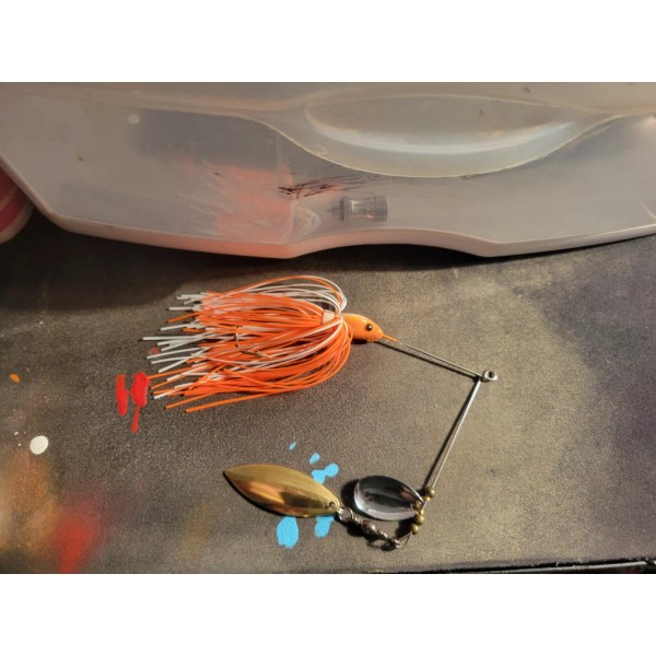 3/8 oz Spinnerbait on 4/0 mustad hooks! These spinnerbait are painted orange, white and a bit of red! They are hand made in Northern utah!
