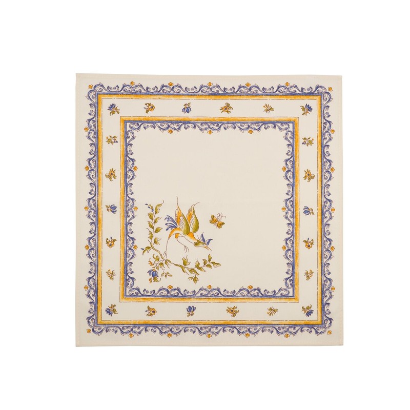 A very traditional Provencal print with beautiful motifs from the Provence region. The village of Moustiers in the Alpes de Haute Provence is famous for its blue and gold bird faience decor. This is an homage to that. With bright colors and its bird and floral motifs, this traditional French classic pattern is a reminder of the style in Provence. Bring that feel into your home.