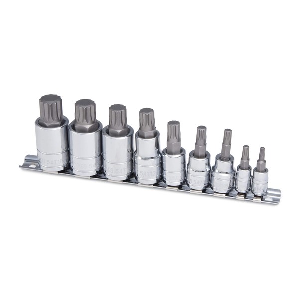 The Titan Tools 16144 9-Piece Triple Square XZN Bit Socket Set includes (4) 1/2-Inch drive, (3) 3/8-Inch drive, (2) 1/4-Inch drive bits, and steel storage rail. The sizes for 1/2-Inch drive bits are M12, M14, M16, and M18, sizes for 3/8-Inch drive bits are M6, M8, and M10, and sizes for 1/4-Inch drive bits are M4 and M5. The S2 alloy steel bits provide strength and durability and the chrome vanadium sockets have a corrosion-resistant plated finish. This Triple Square XZN bit socket set is made in Taiwan.