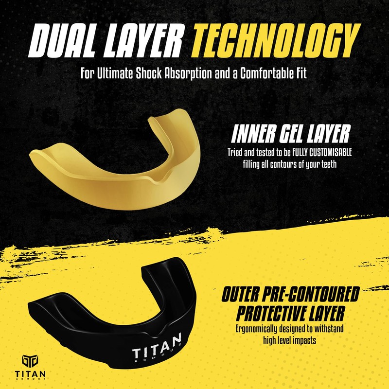 - DUAL-LAYER TECHNOLOGY: What makes our gum shield distinctive is the 2-layer technology comprised of an inner gel layer that flawlessly moulds onto your teeth for a perfect fit and an outer pre-contoured layer that can withstand high levels of impact. The bite-lock technology keeps the mouth guard in place while supporting normal inhalation and exhalation.