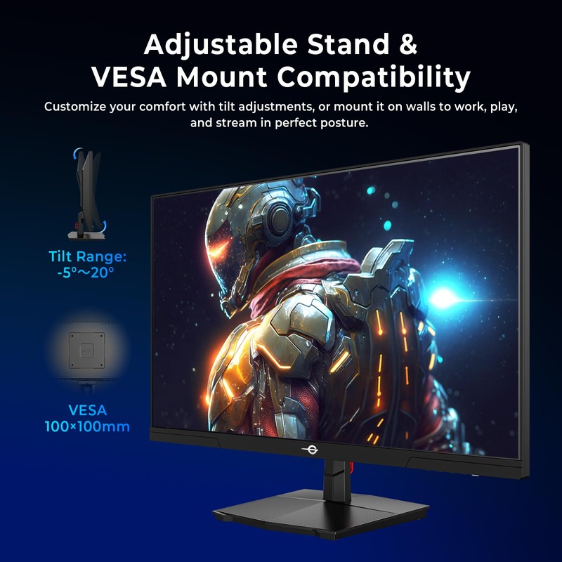 The monitor’s stand offers -5° to +20° tilt adjustment, allowing you to find the perfect viewing angle. For added flexibility, the 100x100mm VESA mount supports wall or arm mounting, freeing up desk space.