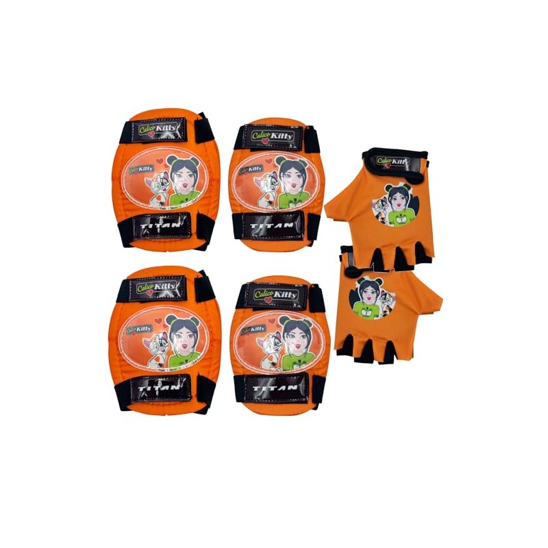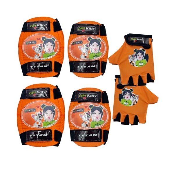 Titan Calico Kitty Multi-Sport Protective Pad Set – Orange, Includes Elbow, Knee, and Wrist Guards, Small-Medium Size